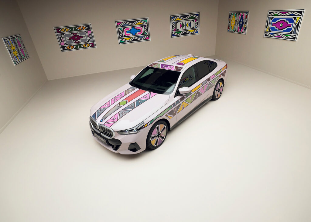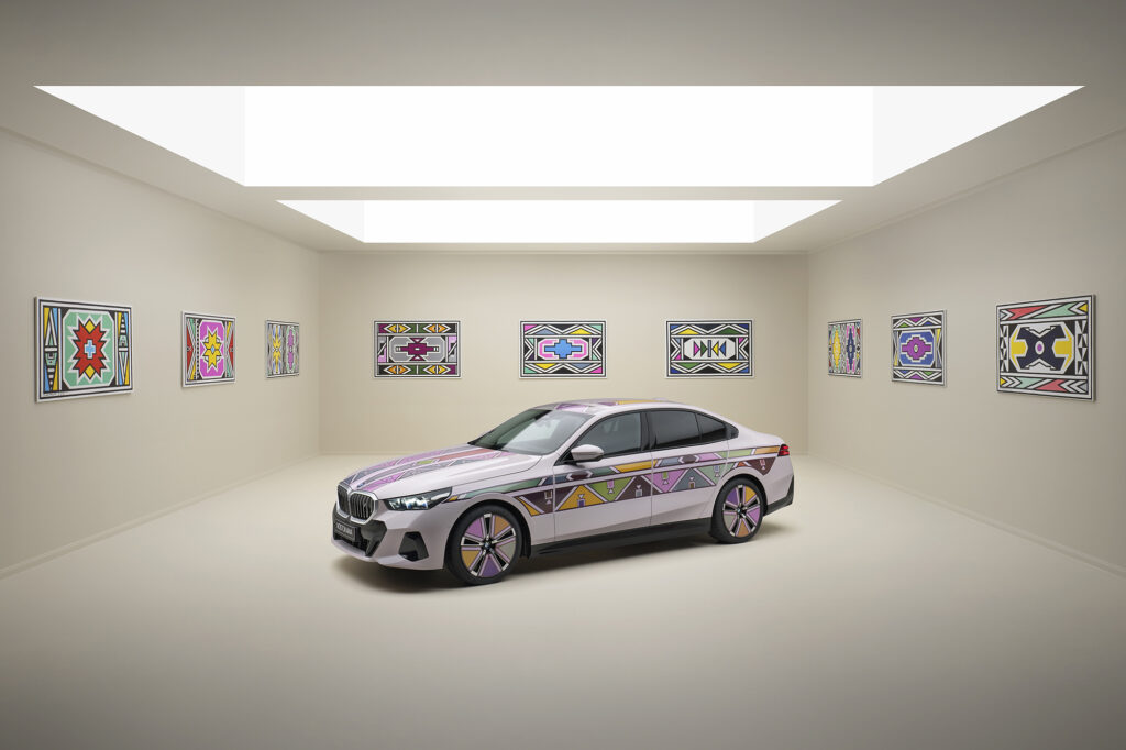 Los colores y patrones geométricos característicos de la artista de 88 años son perfectos para dar vida a la innovadora tecnología Flow en el BMW i5. La versatilidad de los cambios de color electroforéticos hace del sedán totalmente eléctrico una obra de arte dinámica. “Me fascina ver cómo la tecnología moderna puede expandir mi arte y hacerlo accesible a un público completamente nuevo”, afirma Mahlangu.