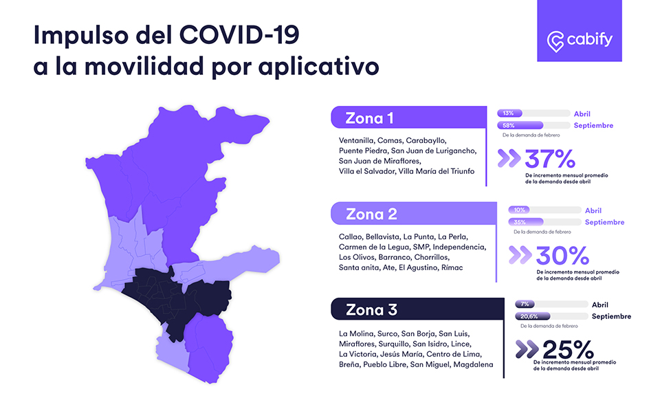 La plataforma de movilidad Cabify ha elaborado un estudio que analiza los cambios de la demanda de movilidad por aplicativos en Lima Metropolitana, cabe mencionar que este segmento muestra un incremento de 27% mes a mes. Los resultados de este análisis muestran cómo la crisis sanitaria ha impactado a los desplazamientos en la ciudad mostrando a la zona periférica como la de mayor demanda del uso de este tipo de servicio.