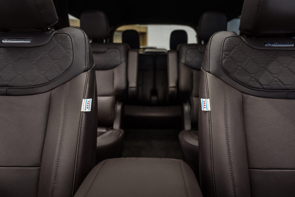 El interior también presenta acabados únicos, incluyendo etiquetas con la bandera de Chicago en los asientos de cuero, el horizonte de la ciudad bordado en la consola central y un sistema de audio capaz de sintonizar estaciones de radio europeas. Los umbrales de las puertas exhiben los horizontes de Chicago y de la Basílica de San Pedro, representando el viaje del papa al Vaticano.