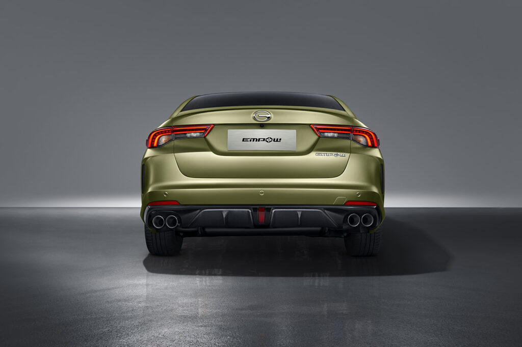 El nuevo EMPOW es el primer sedán que GAC Motor distribuirá en Perú, el cual presenta un diseño deportivo que se destaca por sus faros delanteros con tecnología LED, acompañados de luces diurnas y una atractiva máscara frontal de diseño vertical que integra perfectamente las rejillas de ventilación con el motor y las cortinas de aire en los extremos.  De esta manera, contribuye a la ventilación de los frenos. Además, el modelo incluye aros de aleación de 18 pulgadas, con un diseño tipo estrella y calipers pintados en un vibrante color amarillo.