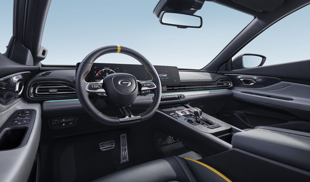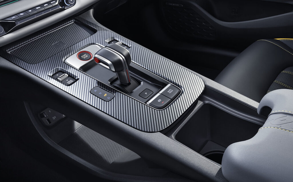 El interior mantiene vivo el espíritu deportivo del modelo, pues cuenta con ribetes en color rojo que resaltan tanto en el volante como en los asientos, los cuales están tapizados al 100% en eco-cuero. Además, cuenta con paddle shifters, también conocidos como paletas de cambio, y al igual que en el exterior, se observan diversos elementos con acabado tipo fibra de carbono ubicados en la consola central y en el interior de las puertas laterales.