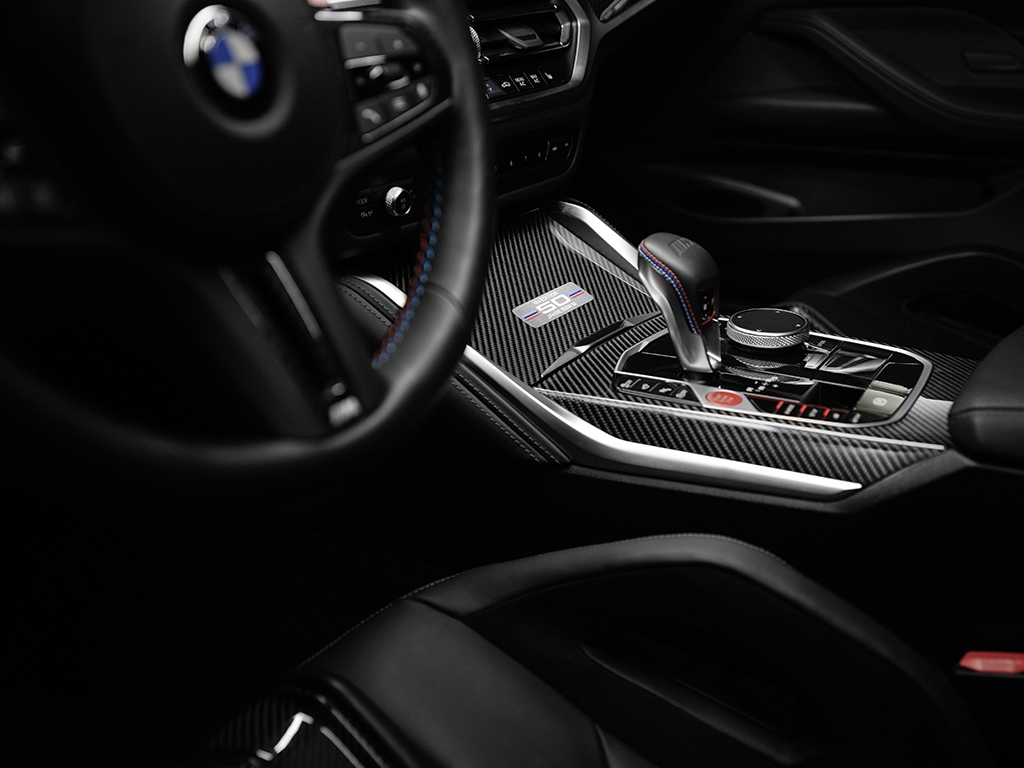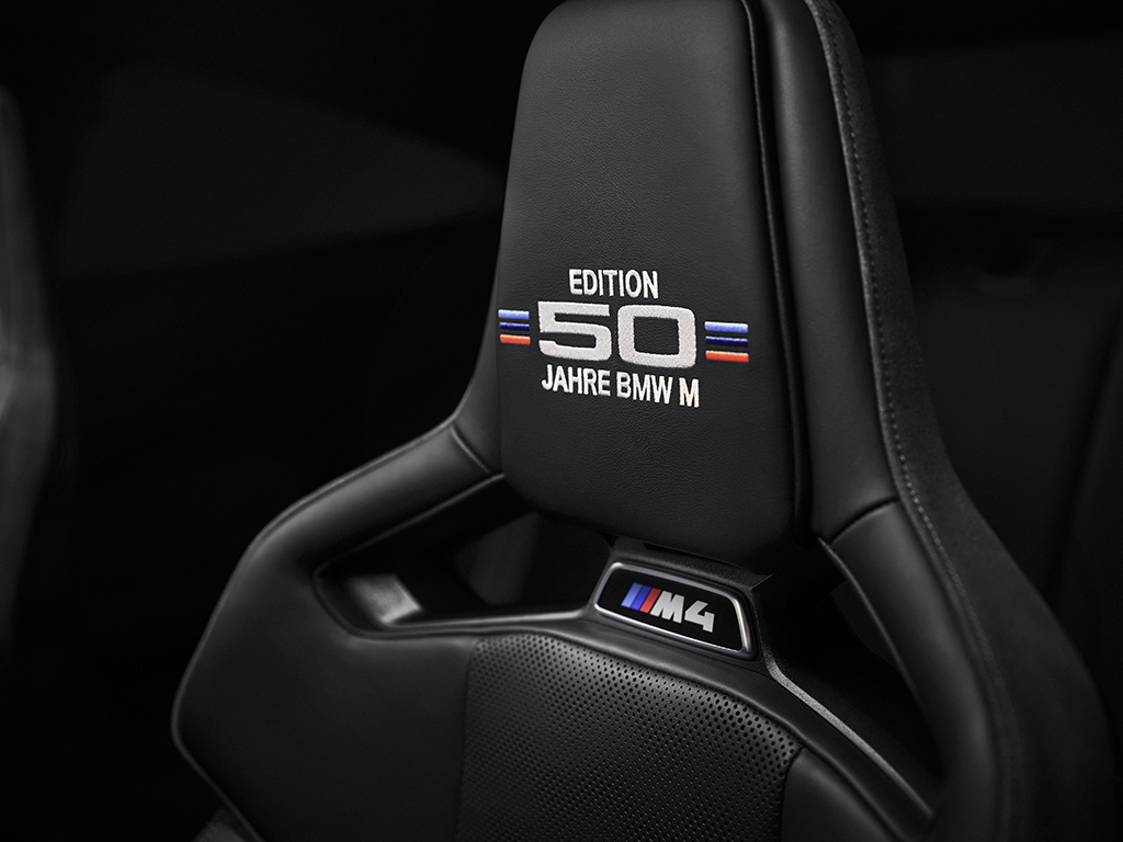 En el interior de todos los vehículos de edición basados en el BMW M4 Coupé, paneles de los umbrales de las puertas con la inscripción “Edition 50 Jahre BMW M”, una placa de metal en la consola central con la inscripción “M4 Edition 50 Jahre BMW M” y la impresión correspondiente en los reposacabezas de los asientos deportivos M de serie y los asientos tipo cubo M Carbon opcionales para el conductor y el pasajero delantero insinúan el aniversario.
