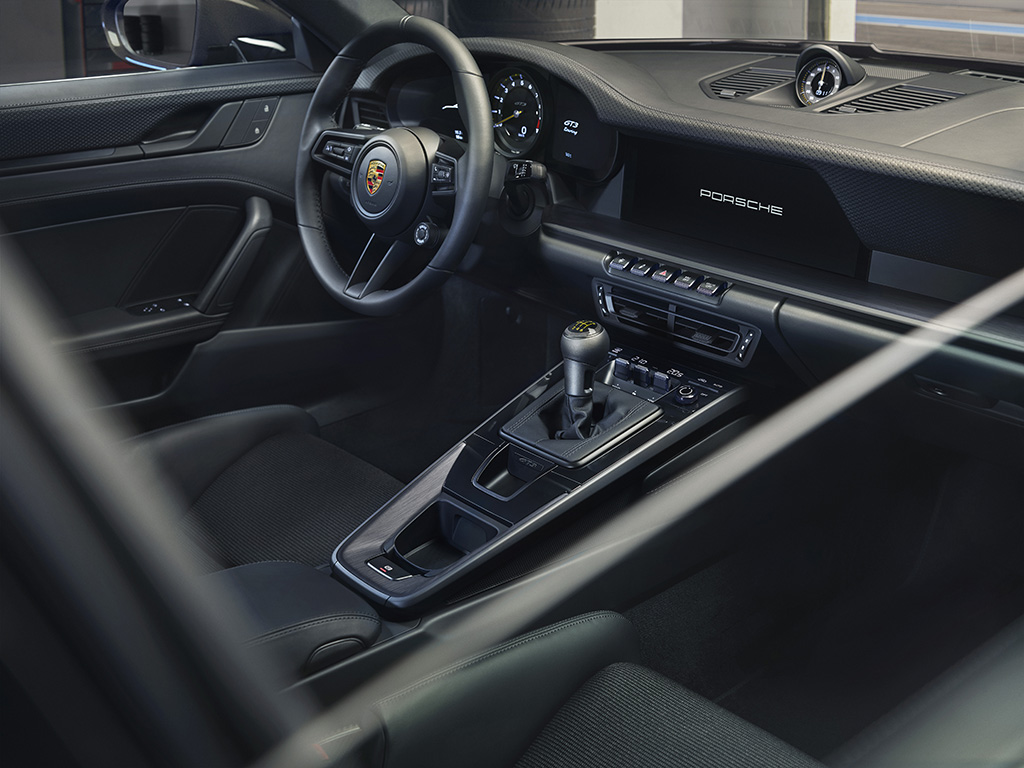 En el 911 GT3 con paquete Touring se respira un aire clásico en el interior, con el cuero negro como elemento destacado, que tapiza el volante, el selector del cambio, la cubierta de la consola central, los apoyabrazos y las correas para cerrar las puertas, entre otros elementos. El color negro está presente en el techo y en los asientos parcialmente tapizados en cuero, con las secciones centrales de tela negra. Estos asientos cuentan con costuras en ese mismo tono y en los reposacabezas figura el escudo de Porsche en relieve. Los protectores de los umbrales de las puertas y las molduras decorativas del tablero y de la consola central están hechos de aluminio negro cepillado.
