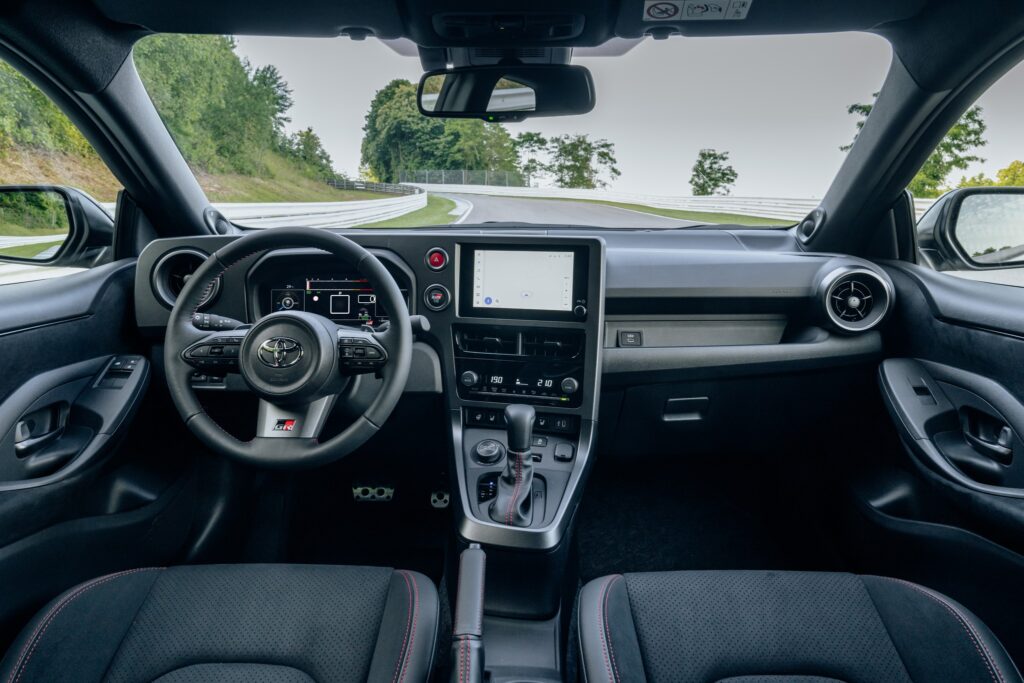 El interior ha sido rediseñado con un enfoque orientado al conductor que mantiene su estilo puramente deportivo, destacando un panel de información digital de 12.3”, pantalla táctil de 8”, sistema de audio con 8 parlantes JBL y acabados que reflejan el ADN competitivo de Toyota Gazoo Racing.
